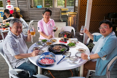 バーベキューは、牛カルビ、豚バラ、ソーセージ、鶏のつくね、タレに漬け込んだラム、そして野菜。シメにヤキソバもつく。