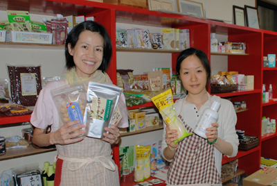 おすすめの自然食品を手にする三ツ井さん(左)とランチに腕を振るってくれた下山店長(右)