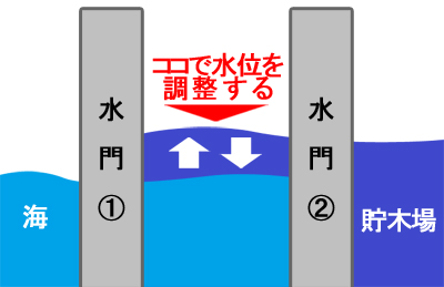 水門に挟まれた水路は言わば緩衝地帯になり、水門の外と内の水位の差を調整する役割がある。