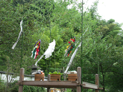 四方に竹を立て、五色の幣や食べ物を供える施餓鬼棚