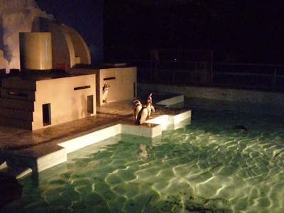 ペンギンは昼間もわりと活発に動いているが、夜はプールがライトアップされて幻想的。