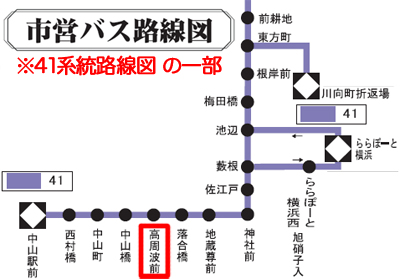 バス停「高周波前」が停車する市営バス41系統は1953(昭和28)年8月1日に開設。「中山駅」から「新横浜駅」まで運行している。