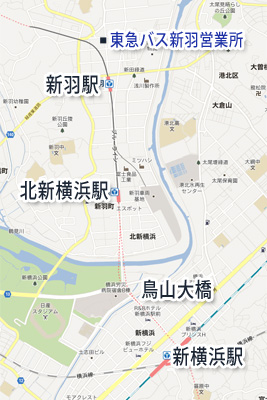 鳥山大橋、北新横浜駅のバス停で乗車する方もおらず、もちろん下車する乗客もいないので、バスはスムーズに目的地へと進んでいく。天気の良い日に貸切状態でバスに乗ることができ、なんだか少し楽しい気分になったのも束の間、新横浜駅を出発してから約10分で新羽駅に到着した。