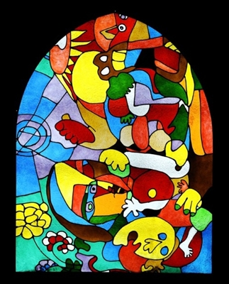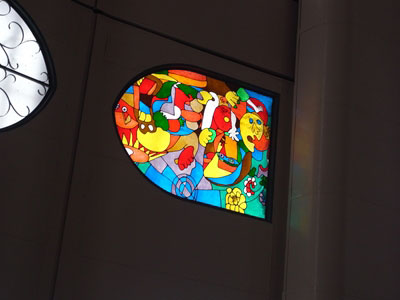 ステンドグラスは「花」をイメージした作品。「ゲルニカ」とは直接は関係ないが、「花に対する鎮魂歌」という思いはある種、通じるものがあった。