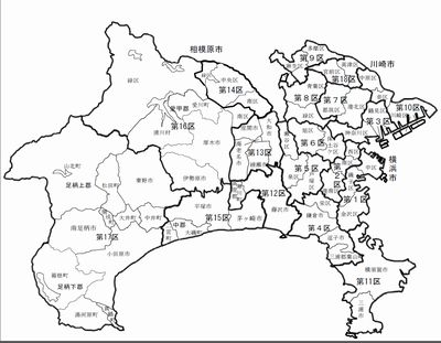 神奈川県の衆議院小選挙区の区割りは下図の通り。