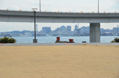 碑の反対側から。海の向こうにマリンタワーも見える