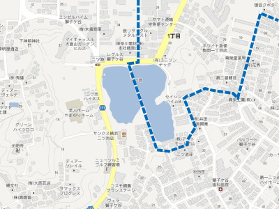 青線の左側が獅子ケ谷で、右側(右上)が駒岡