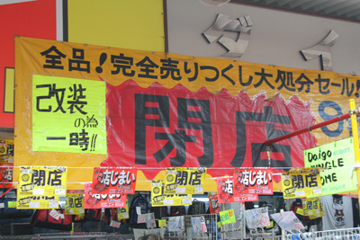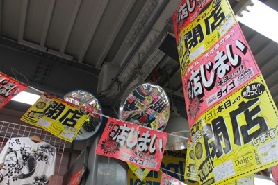 店内には所狭しと「閉店」と書いたチラシが万国旗のように飾られている
