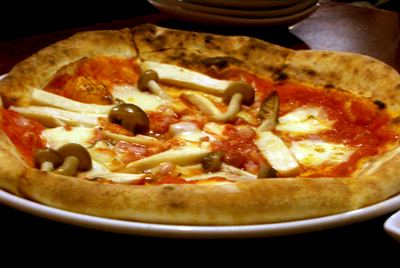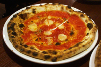 間もなくアツアツのピッツァが出てくる。もちもちの生地で表面がパリッと焼き上がったピッツァに、次々と手が伸びる! チーズと具材のバランスも良く、ホントにおいしい、・・・そしてワインに合う!