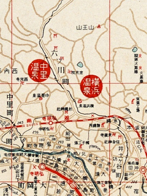 地図を4等分した左上部分の中央あたりに「横浜温泉」を発見