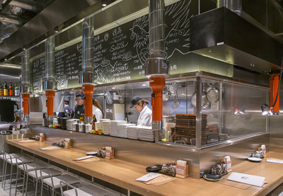 入っているお店は、どこもかなり開放的な造り。店内のざわめきや、おいしそうな香り、運ばれてくる料理を間近に感じて、わくわくしてくる。