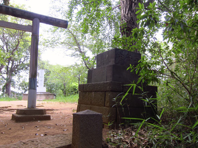 石段101段の上には幅10m×奥行15mほどの空間があり、奥に比較的新しい石碑が立っている。ほかにも狛犬が乗っていたと思われる石の台座や手水鉢らしきものがあり、どちらにも「明治十三年四月」と記されていた。