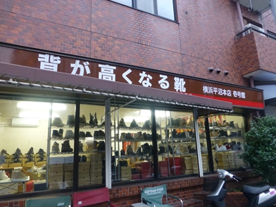 ビルのまわりを一周してみるも、どうやらここは店舗ではない様子。投稿通り、店舗販売はないのか? と思い、窓の広告にあった「背が高くなる靴」で検索してみるとこの近くに店舗があるようだ。しかも「横浜平沼橋本店」とある!