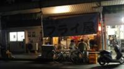 三吉橋でフライをメインにやっているので「三吉橋フライ屋」という垂れ幕を出しているということだった。