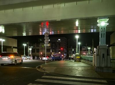 頭上を高速道路が通る三吉橋。中村川は、外国人居留地を分離するために掘られた川だという