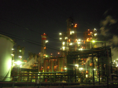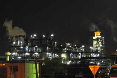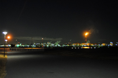 遠めに撮ると夕焼けのよう。煙は工場夜景ならでは