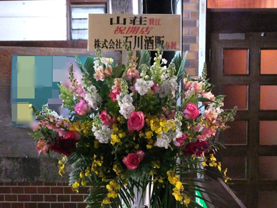 入口には開店祝いの花が飾ってある!