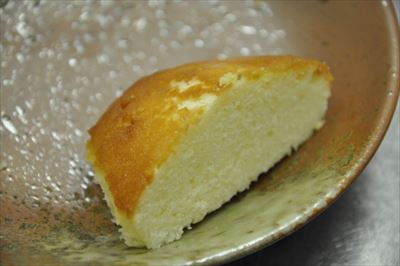 インターネット上で公開されているレシピや、洋菓子店の友人のアドバイスを参考にし、卵白の臭みを消すために、発酵バターとチーズを使ったオリジナルレシピだ。チーズの香りがかすかにするあっさりした味だが、かなり大きく食べごたえがある。