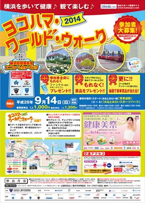 今年の9月14日に開催予定のヨコハマ・ワールド・ウォーク2014。みなとみらい線・馬車道駅をスタートとし、みなとみらいエリアをウオーキングしながらチェックポイントを回り、ゴールは横浜みなとみらいスポーツパークとなっている。チェックポイントにあるスタンプを5個以上集めると景品がもらえる、というもの。主催は市体協。
