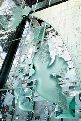 大きなガラスを子細に眺めると、そこに実にさまざまなデザインが描かれていることに気づく。花、砂時計、カモメ……繊細な図柄が透き通ったガラスの世界に浮かび上がっている。