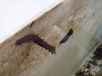 強化プラスチック水槽の壁に稚ナマコが這う様子(提供:神奈川県水産技術センター)