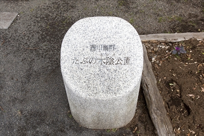 近くに西川島町たぶの木陰公園があるので、まずはそこを目指していくと、マンションに囲まれた公園の向こうに大きな木がそびえていた。