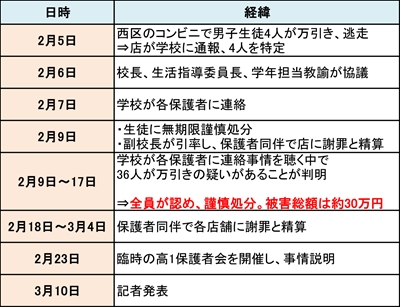 その後、2月7日(土)に生徒から事情を聴いたところ、1人が見張り役で、3人が万引き行為をしたことが分かったため、保護者に連絡。2月9日(月)に保護者同伴で店舗に謝罪と精算を行い、生徒4人は無期限謹慎処分とした。