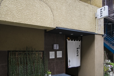 河上さんの料理人歴は42年。いつかは自分の店を出したいと思っていた。生まれは渋谷だが、育ったのは横浜。知り合いも横浜に多かったことから、念願の店を出すにあたって横浜で店舗を探し、縁あってこの場所をみつけた。「かわかみ」の開店は2011(平成23)年8月26日。暖簾の屋号は道場六三郎が書いてくれた。