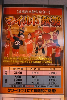 ちなみにマイルド熱波(ロウリュウ)とは大きな「うちわ」を持ったスタッフが、サウナの熱波をお客さんにあおいで送ってくれるというもので、一気に発汗を促すフィンランド発祥のサウナプログラムのことをいう。