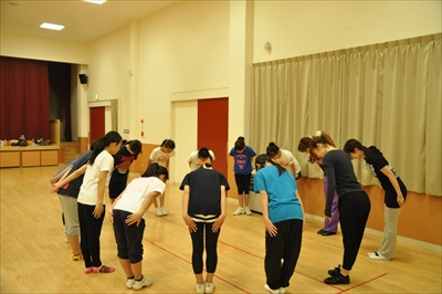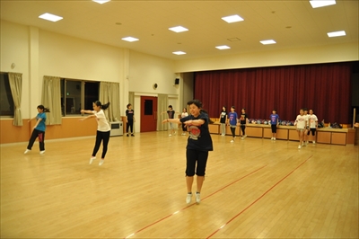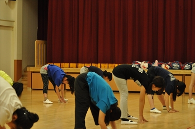 音楽が流れ、さっそく柔軟から練習がスタート(筆者:前列右から二番目)