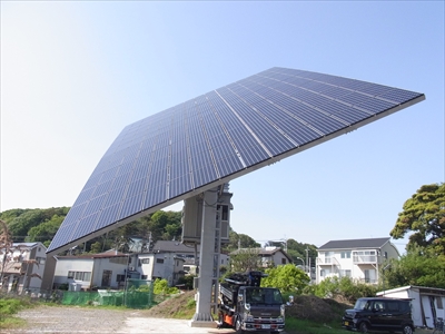 駐車場を経営する地主が土地の有効活用の目的で建てた、巨大なソーラーパネル。発電された電力は東京電力に売っている。