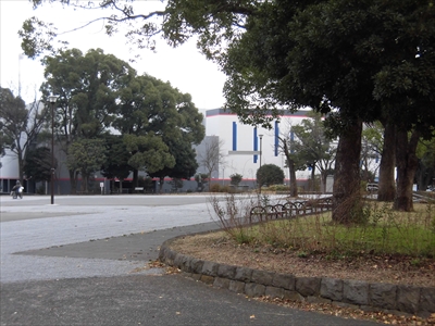 5分ほど歩くと、反町公園越しにカラフルな建物が見えてきた。