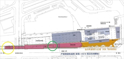 旧東横線桜木町〜横浜間の工事は2021年度に完了予定。2016年度末終了予定で桜木町駅から紅葉坂交差点まで工事を行う。自転車は渡れない遊歩道に。