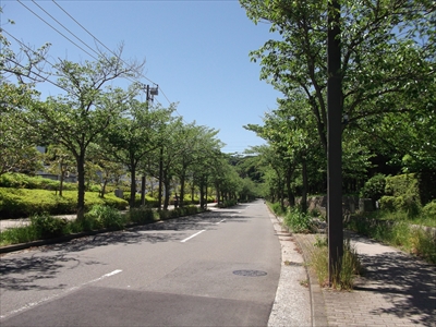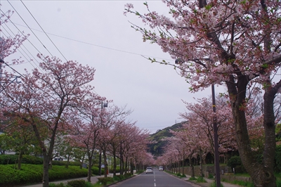 看板のあった場所を曲がると桜並木になっている。花の国まで約500メートルの間に、130本以上の桜が植えられている。