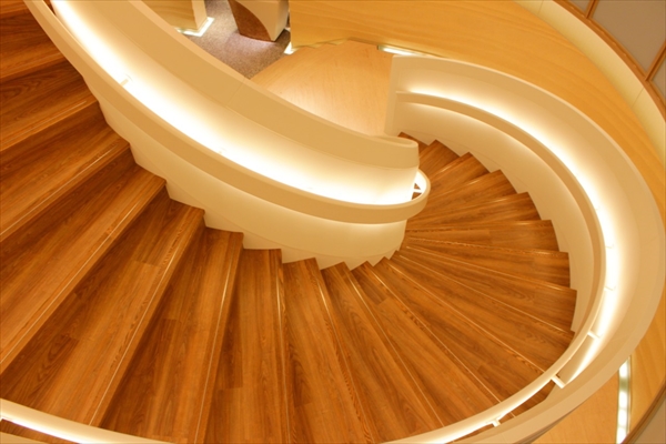 ピアエイトのチェックインカウンターがあるのは2階。そのため、1階のエントランスを入り、エレベーターホールから2階へと移動する。エレベーターホールの中央には、2階へと続くらせん階段が設置され、後述するが2階には受付以外にもレストラン&バーがある。