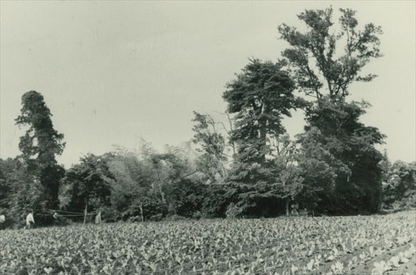 こんもりとした雑木林の森。その前に野菜畑が広がっている。今から半世紀ほど前の神奈川区西部の農村地帯は、おそらくどこもこのようなのどかな光景だったのだろう。