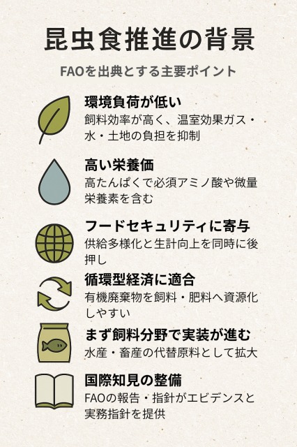 2013年のFAO報告を受け、日本は2021年「みどりの食料システム戦略」で昆虫を「飼料の代替・新素材」として位置づけ、研究・利活用を進める方針を明記。